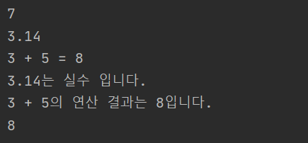 System.out.println(3.14 + "는 실수 입니다.");
