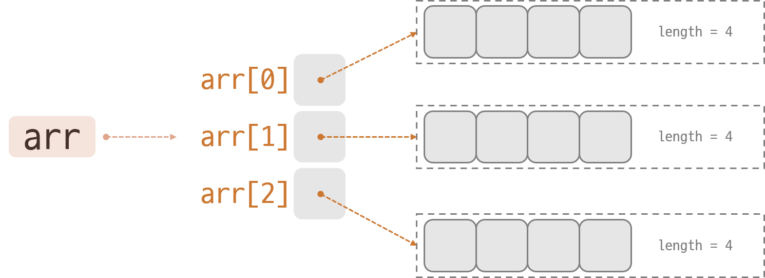 // 세로 길이가 3, 가로 길이가 4인 int형 2차원 배열의 생성